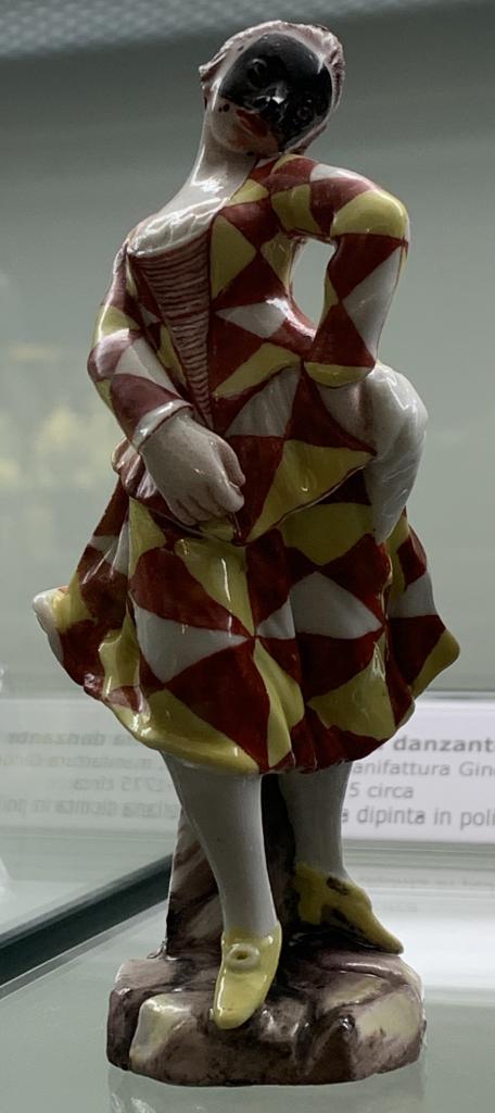 Arlecchino danzante in veste femminile su base a masso squadrato dipinta in bruno e giallo tenue. Il costume è a rombi color bianco, giallo e rosso-ferro.