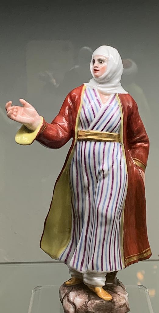 Figura femminile di orientale, su base a masso squadrato dipinta in diverse tonalità di marrone, con la mano sinistra in tasca, il braccio destro sollevato e piegato. Il costume è composto da una lunga veste bianca a righe verticali azzurre e viola con fascia dorata in vita, e da un soprabito color rosso-ferro scuro, con risvolti gialli e profili dorati. Il capo è avvolto da un velo bianco, fermato sotto il mento alla maniera orientale. Il volto dai lineamenti molto delicati, è ravvivato dai consueti puntini rossi sulle gote e neri intorno agli occhi. L’oro e compatto e brillante.
