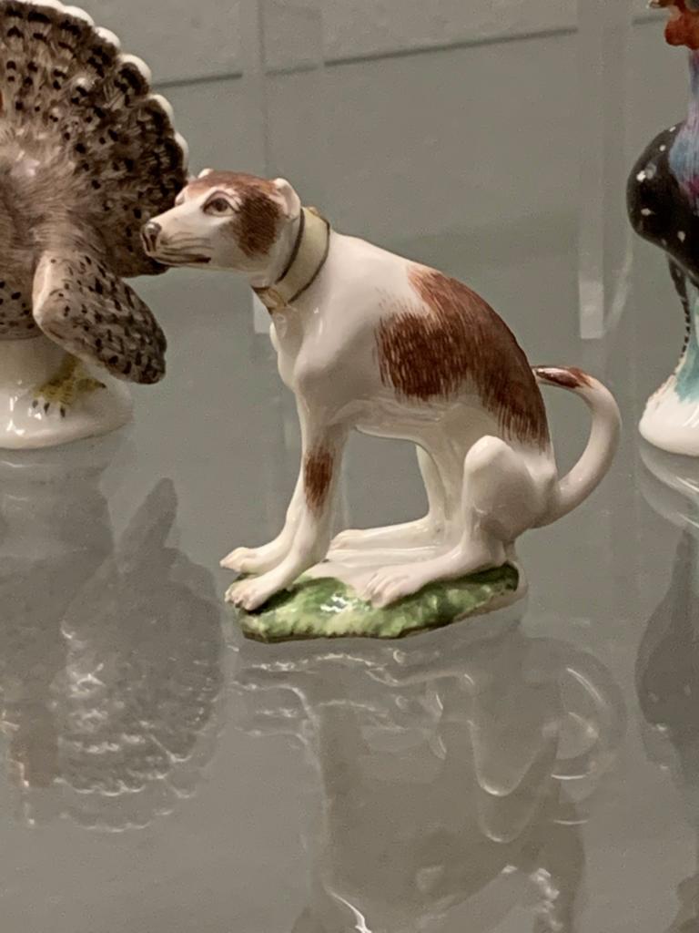 Cane levriero accucciato in miniatura, con lunga coda rivolta all’insù, su base bianca con tocchi di verde. Il pelo è bianco con macchie marroni rese con fine tratteggio; intorno al collo è allacciato un collare giallo con fibbia e anello dorati. Sotto la base non verniciata è praticato un piccolo foro regolare.